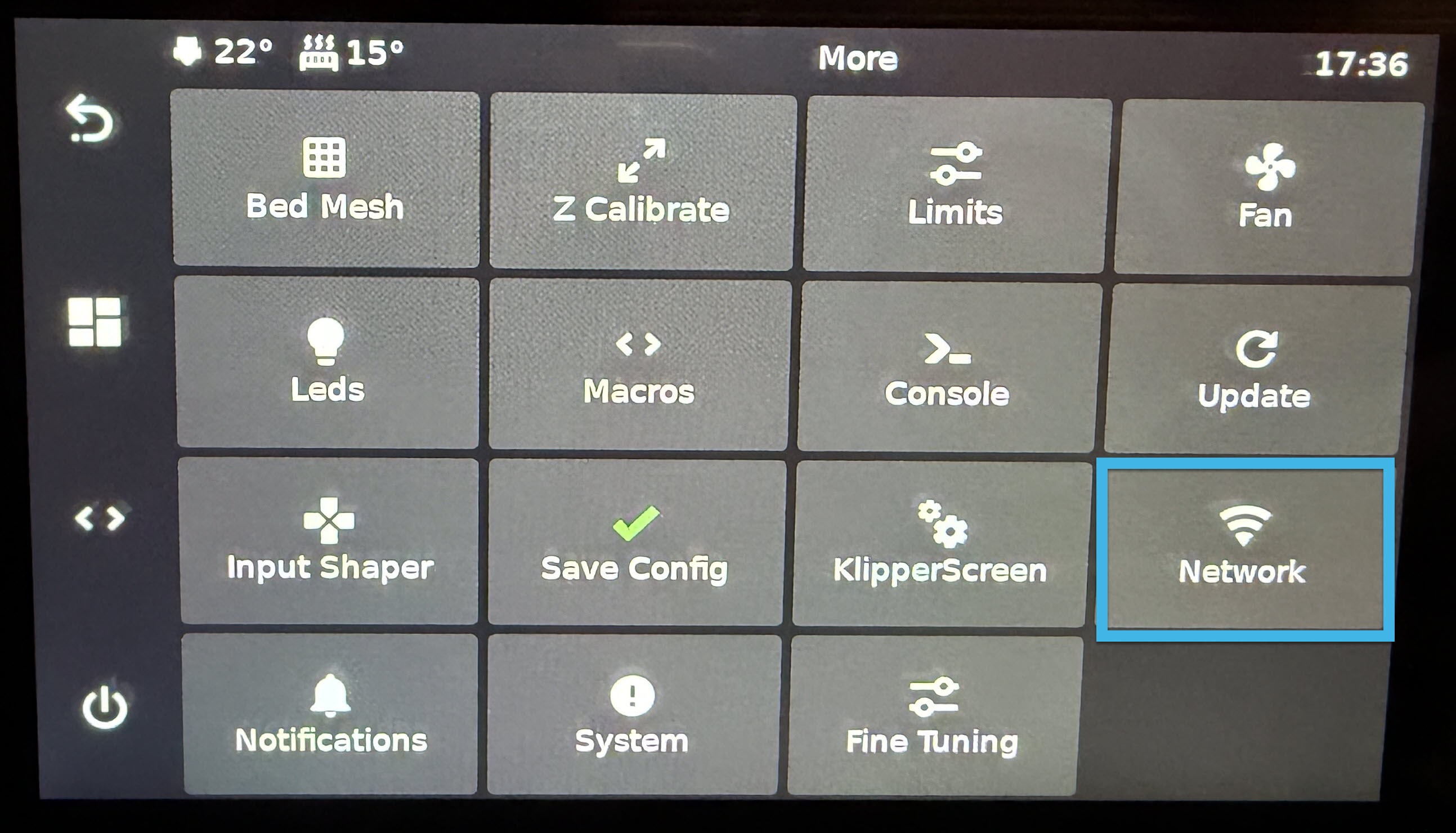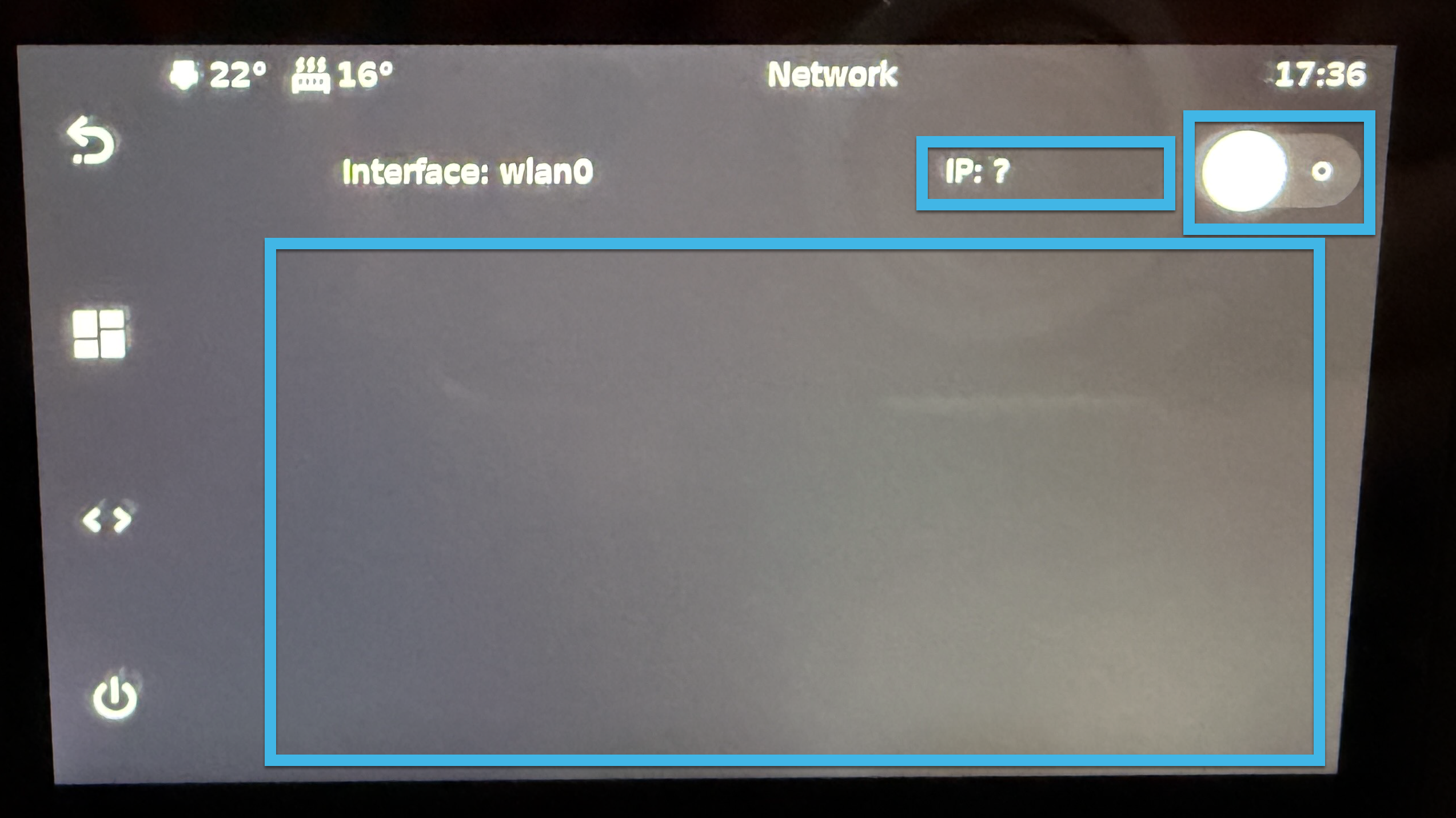 To the left of the switch, you will find the IP address. This will list the IP it is currently connected to. If you are attempting to access the web interface, this IP address is one way to get to it. You will also need this to connect your slicer, such as the Orca Slicer, to your unit.